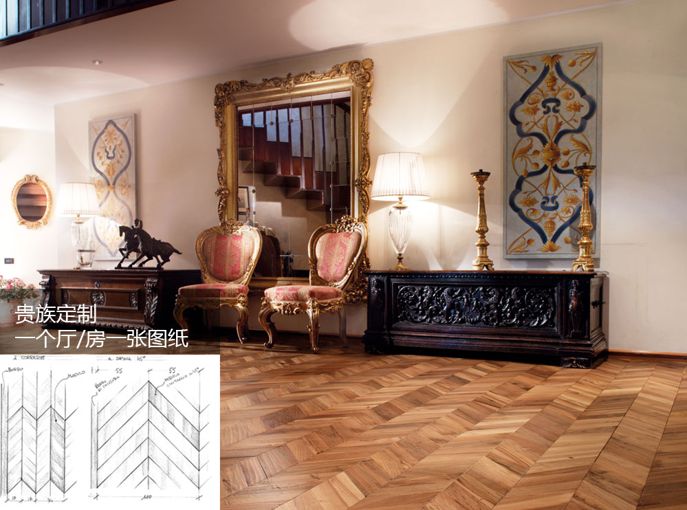 菲列德羅全部由意大利設(shè)計師針對上流社會交付的家居裝修平面圖,進(jìn)行一對一的個性化定制設(shè)計、并由工藝精湛的威尼斯工匠,根據(jù)該系列圖紙逐片地板手工制作,一個廳/房一張圖紙,一個整托的包裝地板安裝一廳/房,產(chǎn)品制造后直接從意大利進(jìn)口運送到中國,由專業(yè)技工根據(jù)意大利圖紙完成鋪裝。整個過程為高級度身定制的一對一服務(wù)。