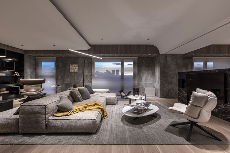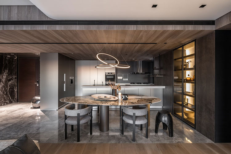 山景環繞的居住環境,要把最大的空間都留給“共處”的起居空間,多處的旋轉門軸、移門給空間更多互動串聯、時間次序、使用方式等。客廳中間部分全敞開,作為家人之間共居的生活型態(影音、工作書房、視聽書房、廚房、餐廳、閱讀區等)。幾乎沒有什么走廊的產生,用天花造型跟地坪分割,營造出空間的軸線位置,區別出層次與機能。
