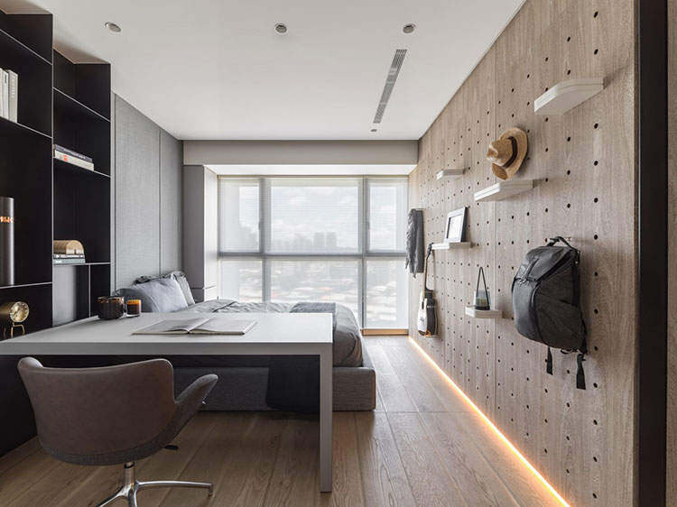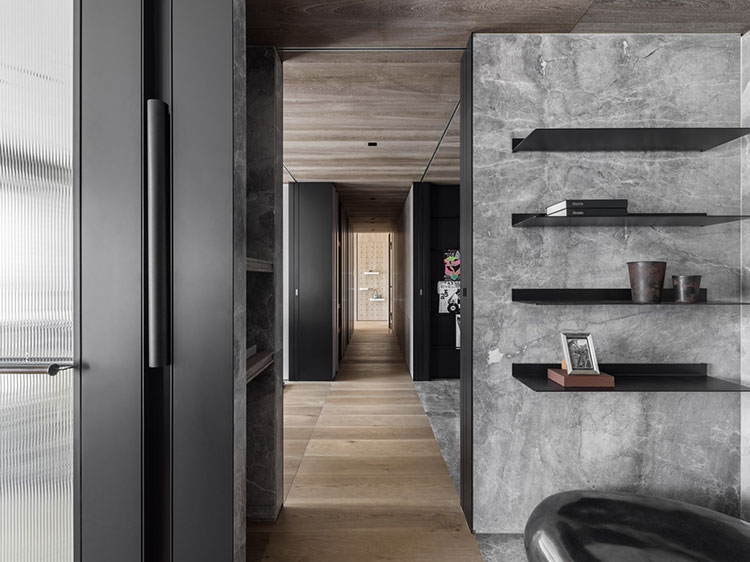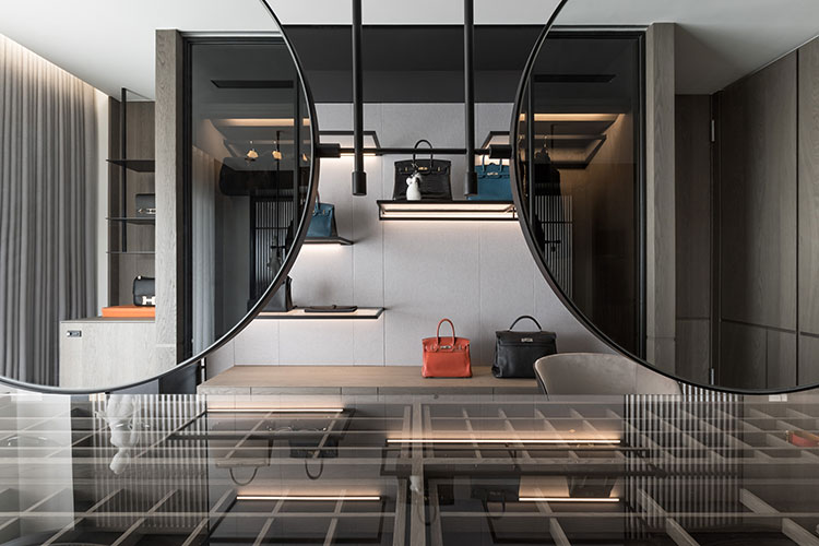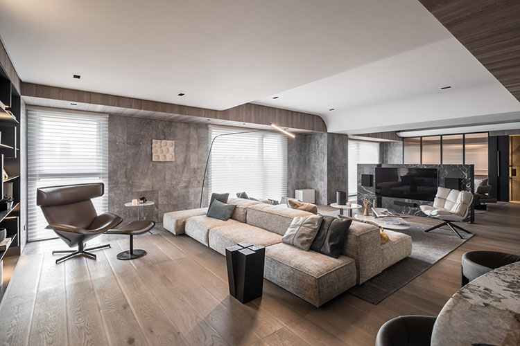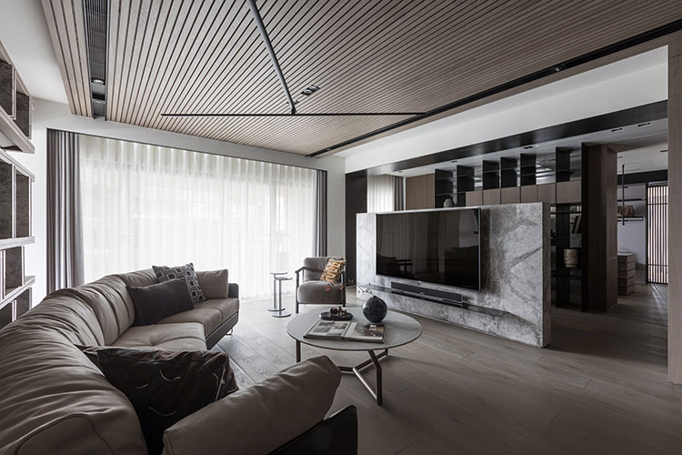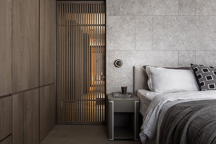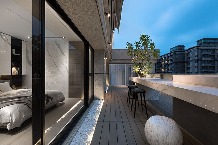 經由玄關儀式性的空間氛圍塑造,由外而內,轉換到公區開放式的場域。天花格柵方向性的引導,讓視覺及心境由壓縮至釋放,后延伸至窗景。跟隨視線及動線的引導由公入私,展示性更衣間成為公、私領域的中介空間,穿透格柵、隱藏拉門在動線、視覺及空間序列上創造出層次感與穿透感。兩間臥室各自面對著自屬的戶外陽臺,藉由大面落地窗并延續室內材質元素,連結內外空間材質,模糊彼此界線,延伸視覺范圍,引導居住者的心理感受。整個空間以壓縮再釋放的手法,將喧囂的都市意象透過「一進、一景」的空間層次安排,從壓縮至釋放,歸于心靜。