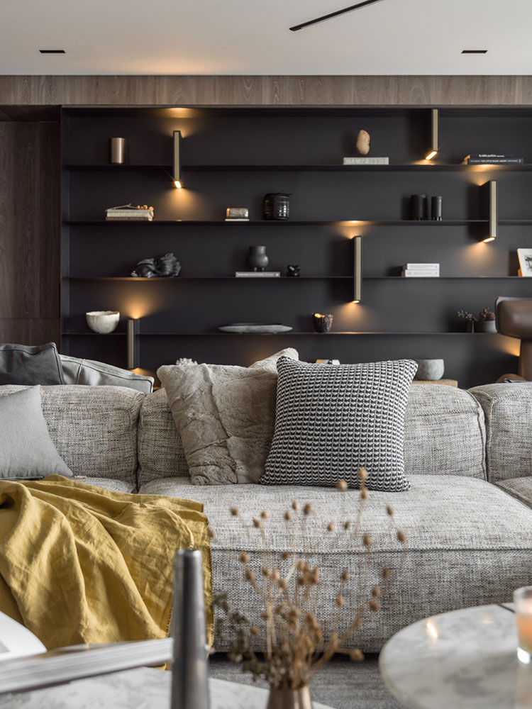 公區域天花設計是一卷大大的樂譜攤開,暗示了業主家的品味喜好,弧線型的設定,讓空間感受更為柔軟,解決合并戶型中間分戶低梁的壓迫感。大大的長桌串連起家人的生活圈,不論是功課、家教、讀書辦公都可以在這邊進行。雙向沙發那側是一個完整的閱讀區域加上家庭劇院區域,可以自由拼組的沙發提供了更多元的空間玩法。以書的造型作為書柜分割燈,大小塊量體飛到墻上,成為鐵件柜體的輔助結構、以及書擋的功能。整體空間里運用了較溫潤的色調以及自然的材質做為空間中的溫度感受,讓空間感受更為柔軟。