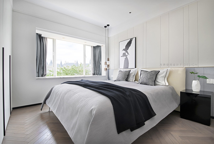 次臥床頭一側吊溫馨小吊燈,增加氛圍光。房間沒有太多的裝飾物,采用極簡的配色,追求空間寬敝。