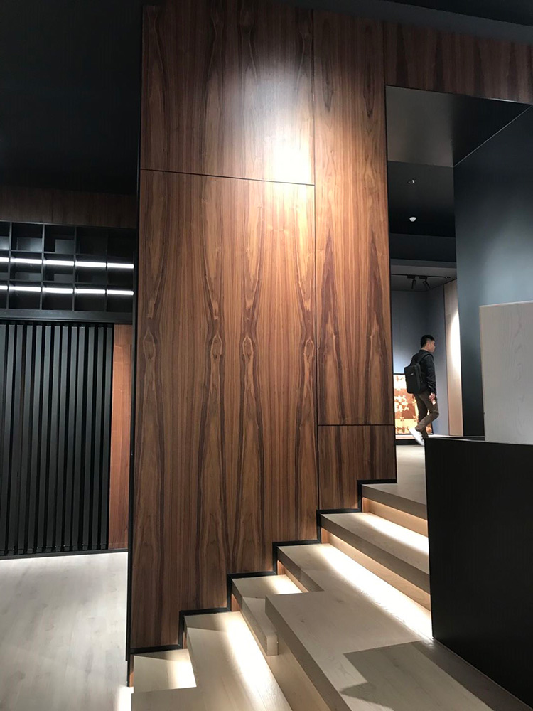三面縱向墻體將主題空間規整起來,更好地體現出空間效果。橫向的長條形臺階使得原先的落差得以有效過渡,且可以兼顧地板展示及綠植擺放,使得整體空間變得大氣開敞。