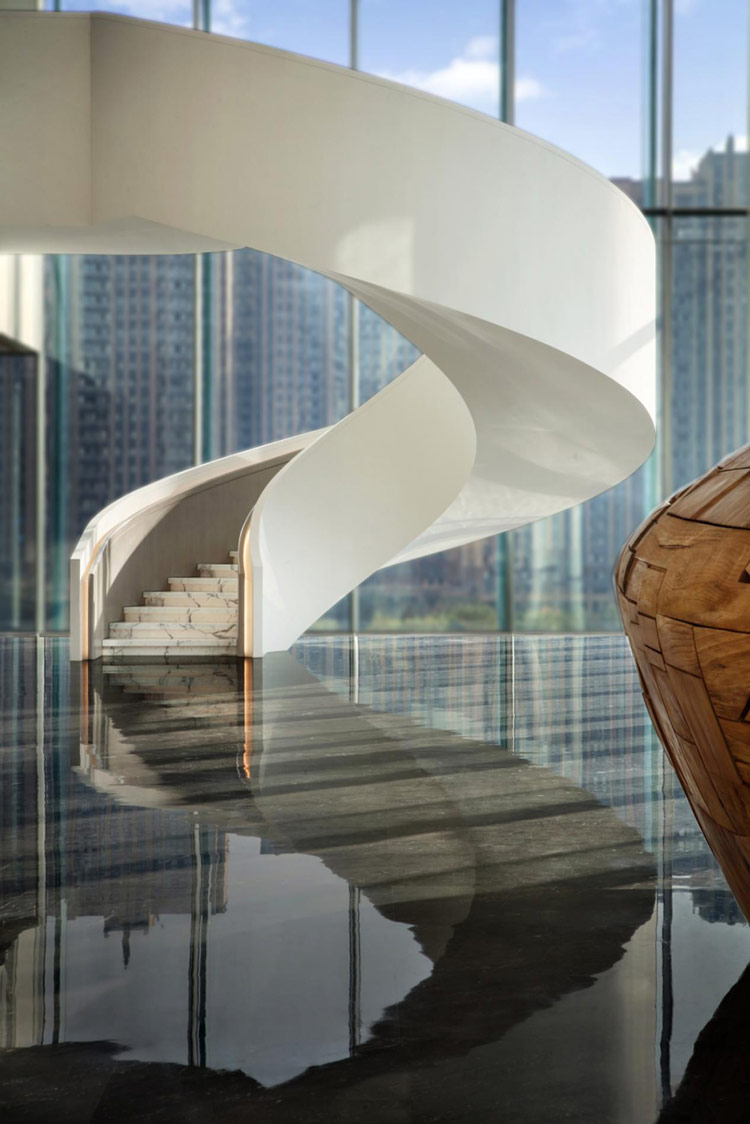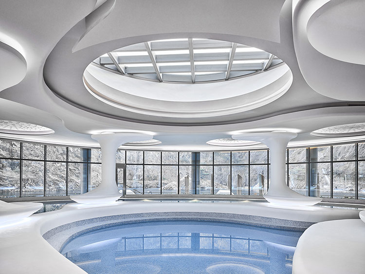 上海佘山世茂深坑洲際酒店建造于原本為采石礦的深坑之上,為了將原始深坑的粗糲質感和周圍自然環境相融合,酒店室內采取“礦·意美學”的理念進行設計,將原生粗獷的巖石崖壁與縹緲雅致的山水自然相結合,打造出專屬于世茂深坑酒店的意境文化。