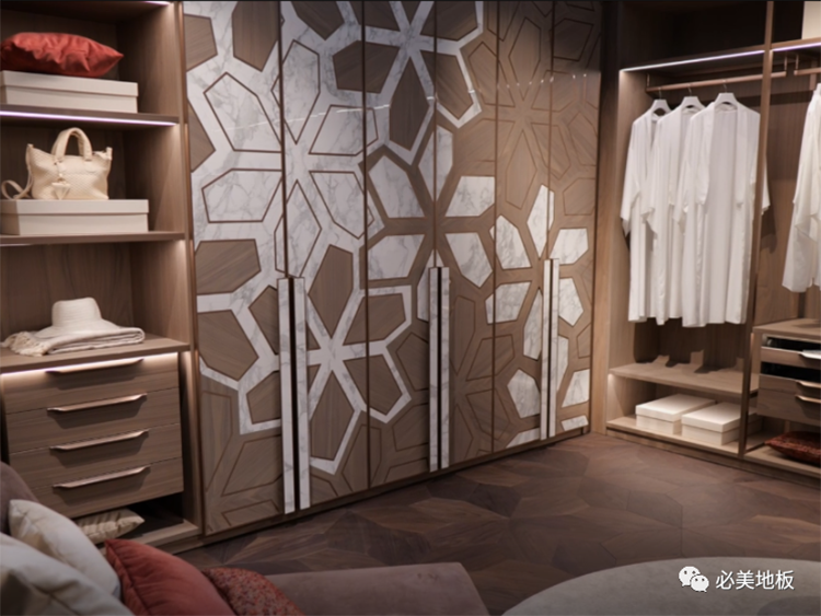 比如,本次展出的3D護墻板可根據項目的不同風格,按照客戶或設計師進行定制,為“墻地一體化”流行趨勢創造更多可能性;具備高端代表性的嵌入式衣帽間也采用定制方式制作,結合了木材、大理石、金屬,融入了必美菲列德羅經典的阿扎利亞拼花設計,可選藍色、中國紅、愛馬仕橙等顏色。