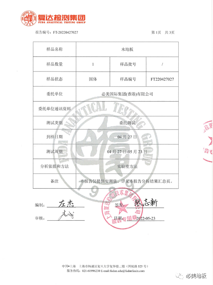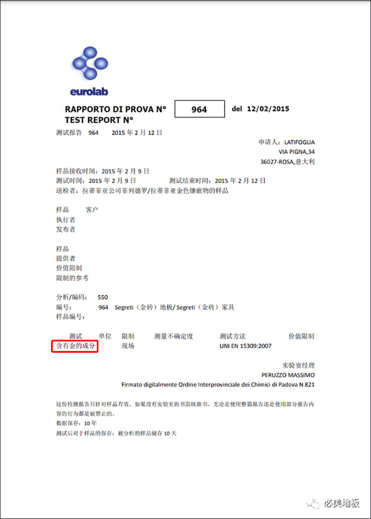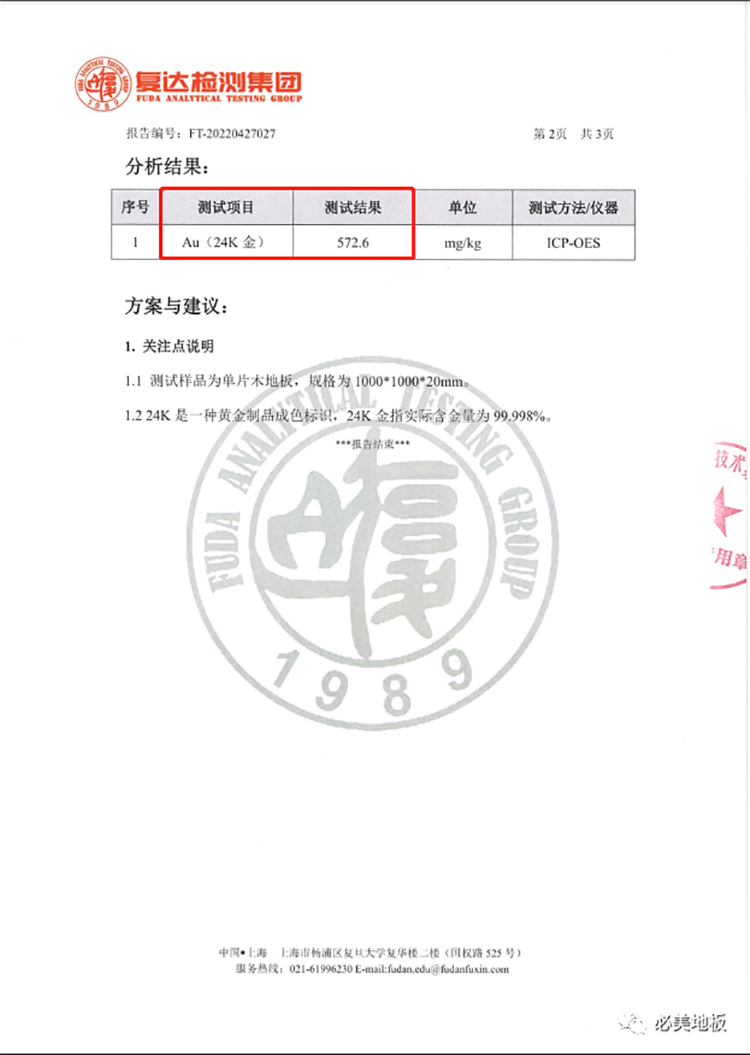 金磚地板還具有雙重“黃金身份證”,經(jīng)過歐洲權(quán)威eurolab(歐洲實驗室)和國內(nèi)第三方檢測機構(gòu)復(fù)達(dá)檢測集團 的成分檢測,測試結(jié)果均表明必美菲列德羅金磚地板確含24k金。