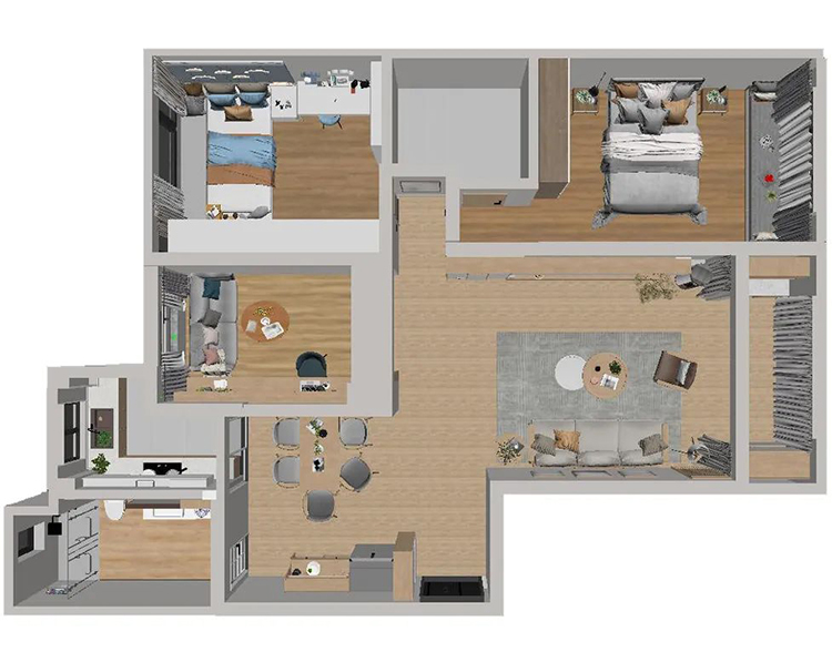 本案采用了現在很受歡迎的原木風設計,多處運用了原木元素,為家居帶來自然氣息,營造溫馨生活氛圍。