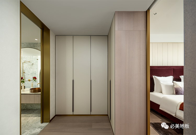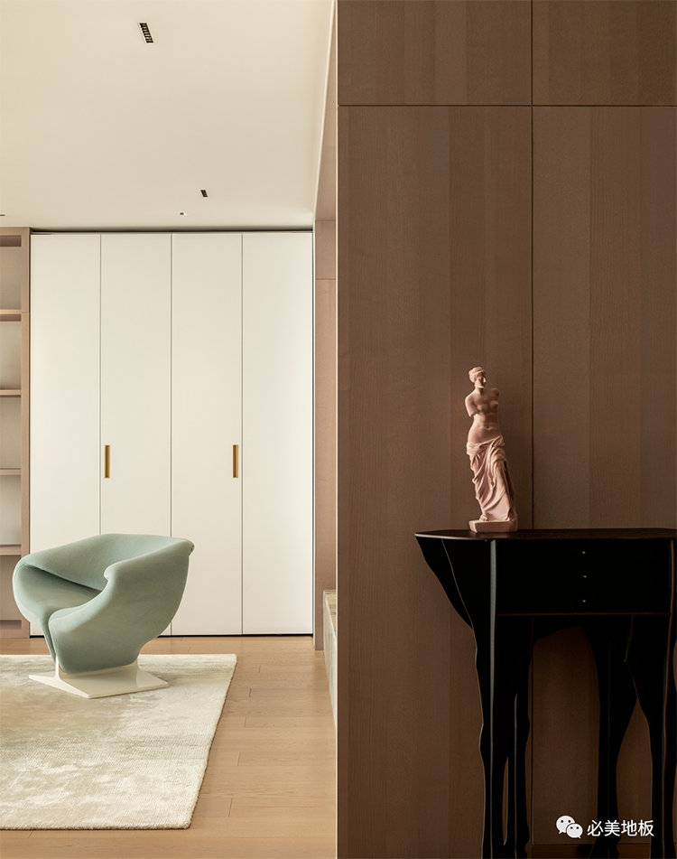 私人空間充分考量到居住的舒適性,衣帽間根據高度做落地一體化設計,其皮革材質與主臥墻面兩相呼應,體現整體和諧感。