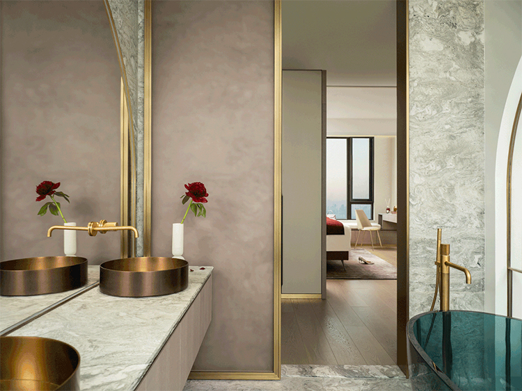 大面積綠色石材鋪陳出水紋流動的效果,墨綠透明浴缸,讓室內更為通透,與窗外的江景構成內在呼應。