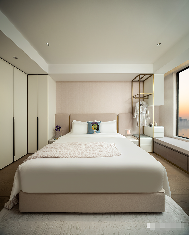 所有臥房都是南向望江,兼備自在與優雅的豪宅氣質。女兒房以不同的粉色材質構成了豐富層次,再由金屬勾邊、收口,凸顯極致工藝。