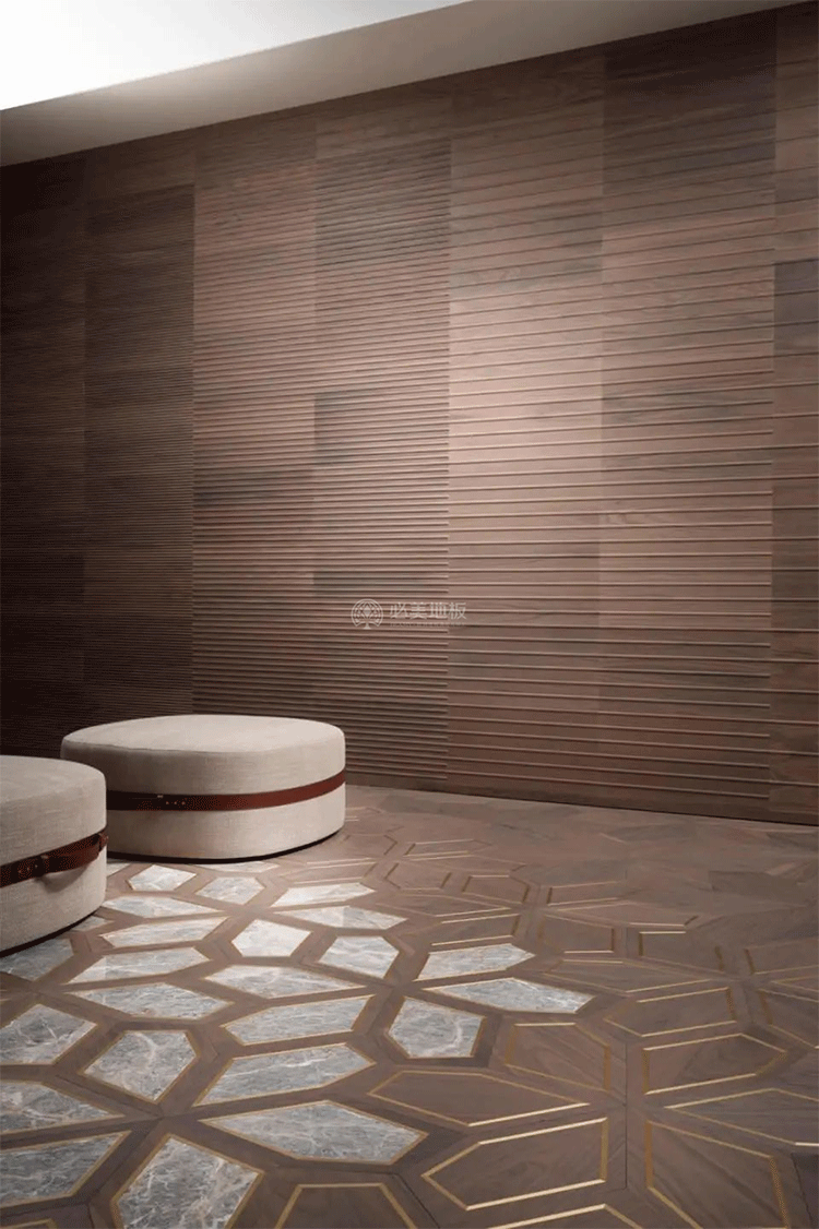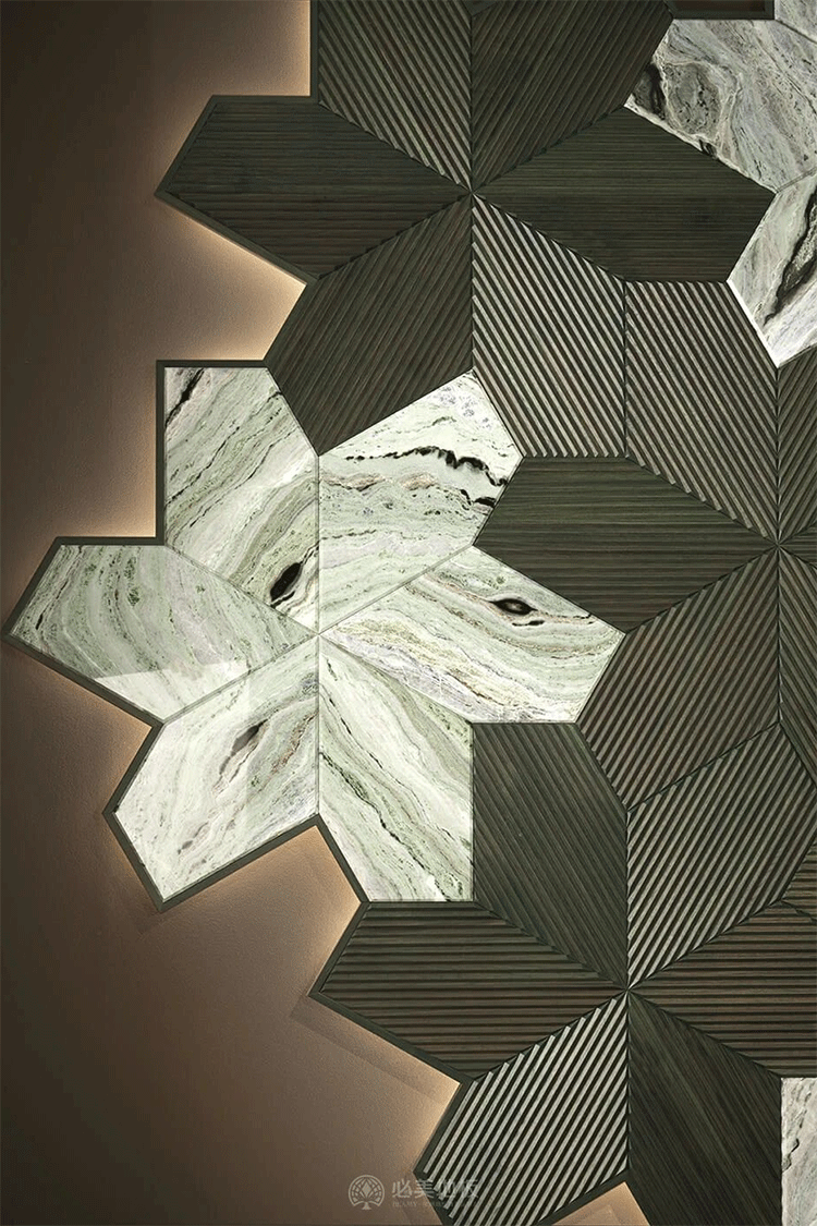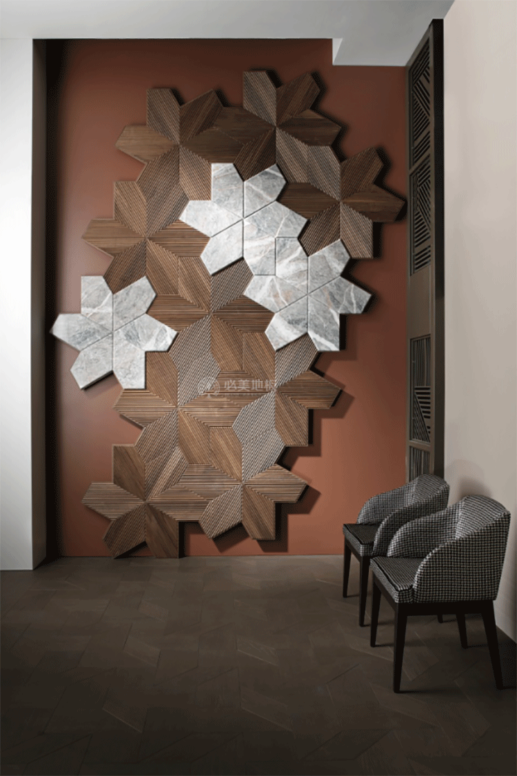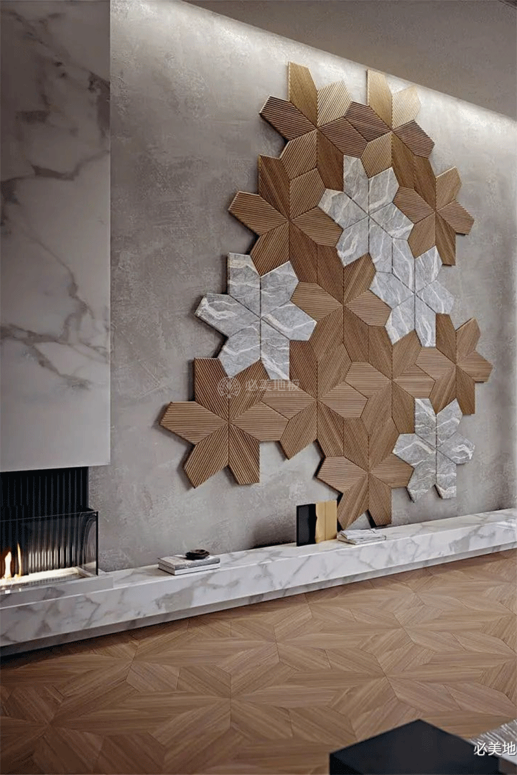 必美菲列德羅阿扎利亞的3D藝術護墻板以經典的花瓣型拼貼方式,結合木頭與大理石/金屬條等材料元素產生奇妙的碰撞,全屋定制的品味與檔次,讓空間里的每個角落都充滿自然藝術的高級質感。