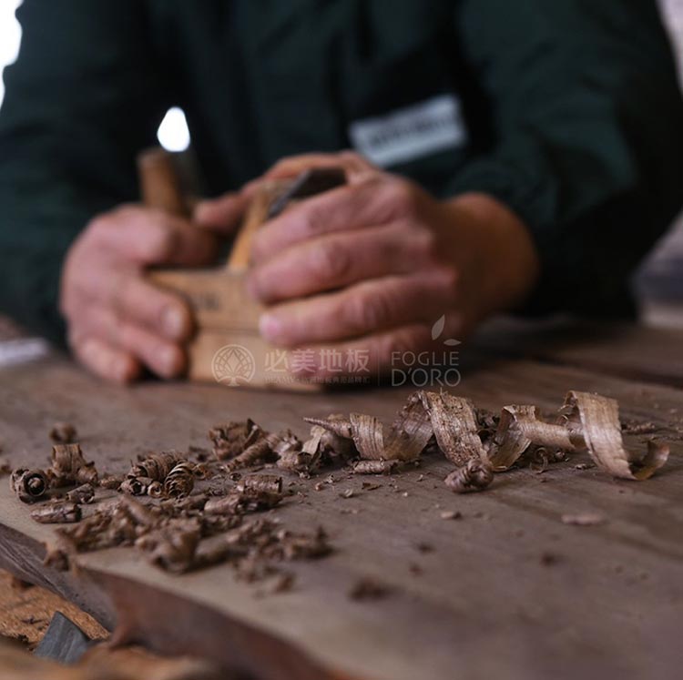 他們堅持用最天然的木材,砍伐后先在室外進行2年自然風干,再轉(zhuǎn)移到室內(nèi)繼續(xù)長達三年的靜置養(yǎng)生,從制作初始就確保木材的穩(wěn)定性,最后經(jīng)過威尼斯工匠的純手工打磨,打造出獨一無二的地板產(chǎn)品。