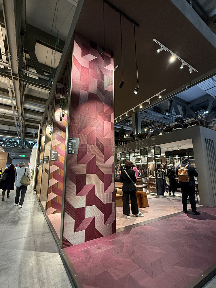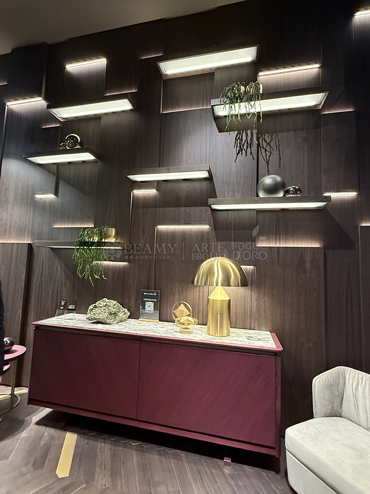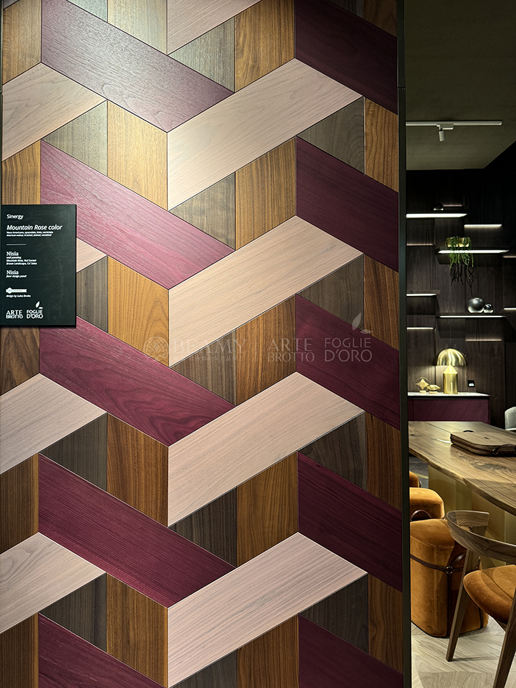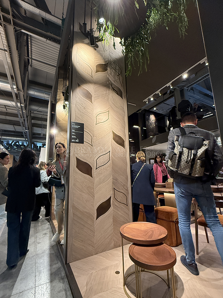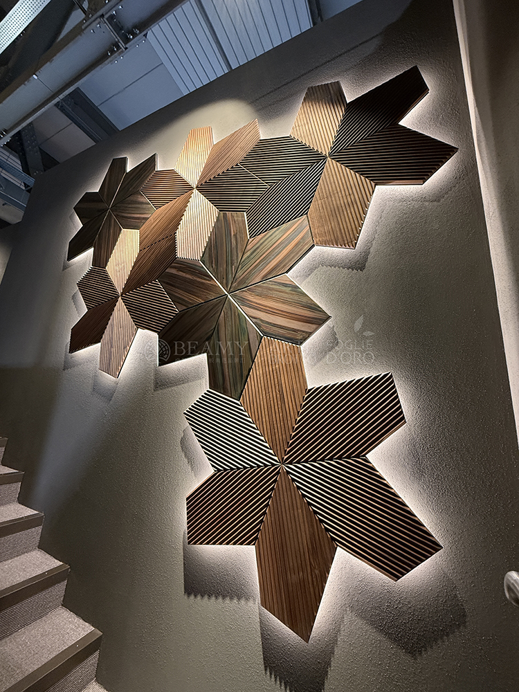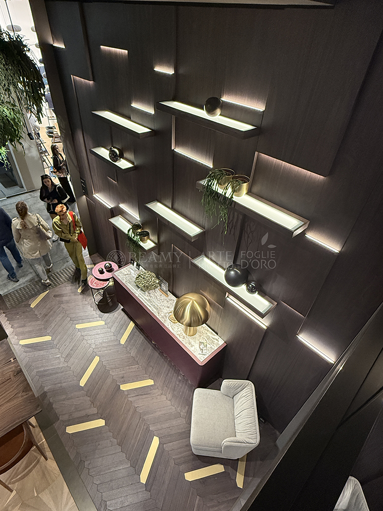 在展廳二樓部分的Azalea拼花墻板也在市場首次展示,這款特殊的效果是金屬經(jīng)過氧化而成的,3D立體的視覺效果,邊緣有特別的V槽設(shè)計(jì),結(jié)合了全新的鋼材元素,5毫米厚的金屬將鋼材的V槽延伸過渡到了木質(zhì)的部分,是由必美菲列德羅獨(dú)家發(fā)明的產(chǎn)品。