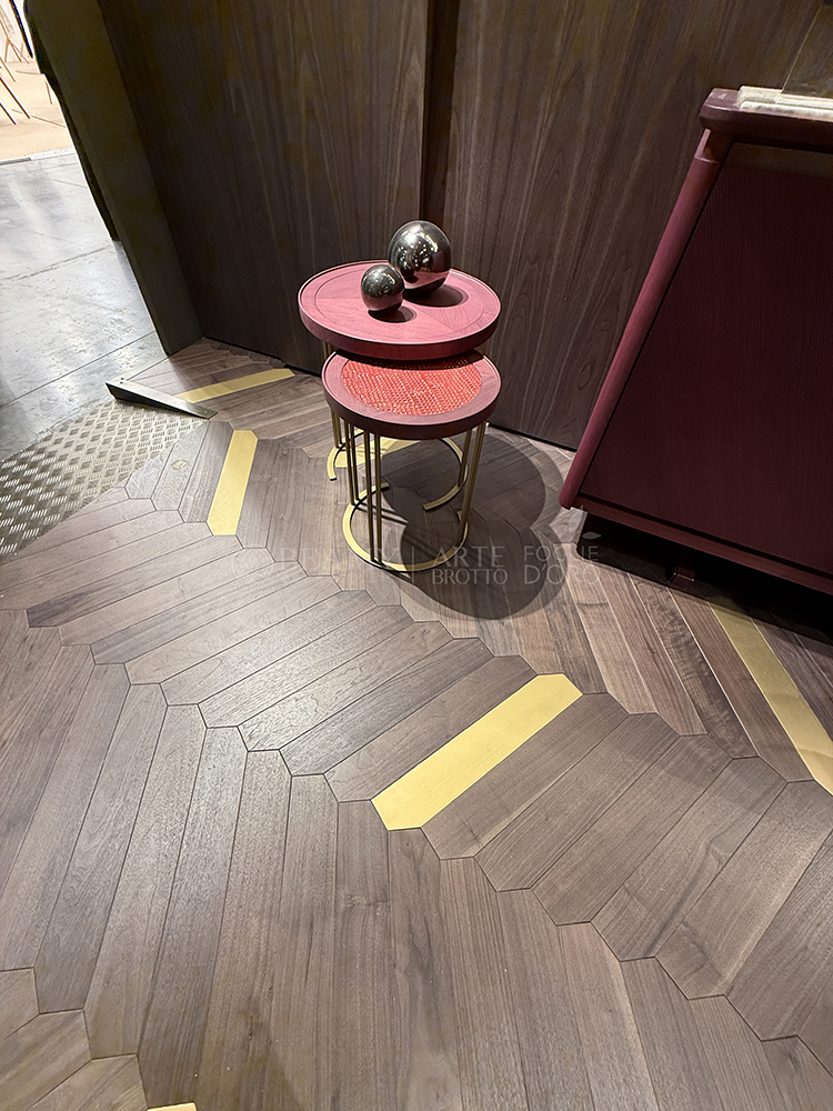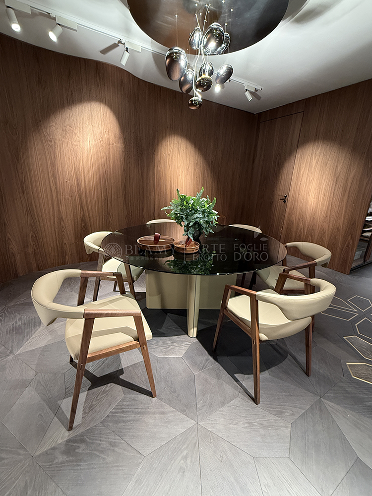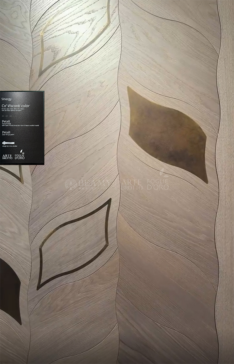 Petali拼花運(yùn)用了自然的色差結(jié)合金屬材質(zhì)及手工制作的黃銅線條和板塊,每件產(chǎn)品都是獨(dú)一無二的,在空間氛圍中賦予了所有的色彩和感覺。