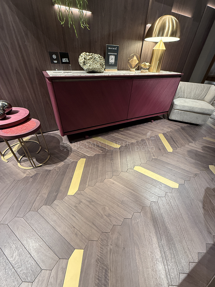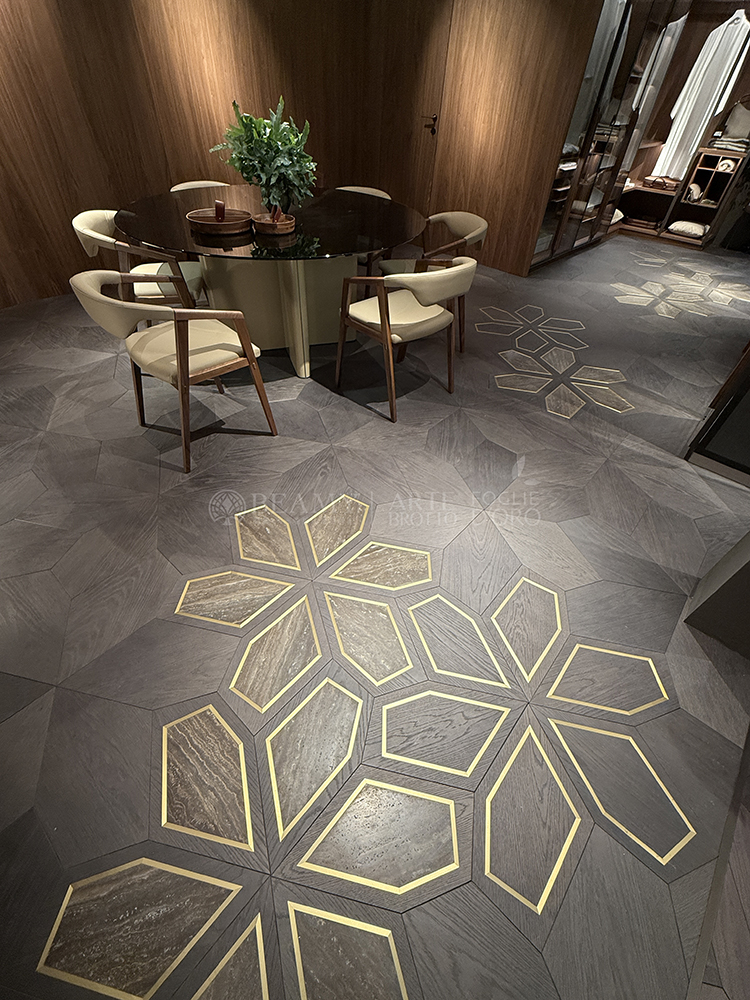 這款全新推出的Azalea拼花地板使用了一款橡木的顏色搭配了黃銅的線條以及奢石的鑲嵌,Travertino Titanio是來自意大利的奢石,經(jīng)過特殊處理做成了啞光的飾面,為家庭空間賦予了非常高端的效果。