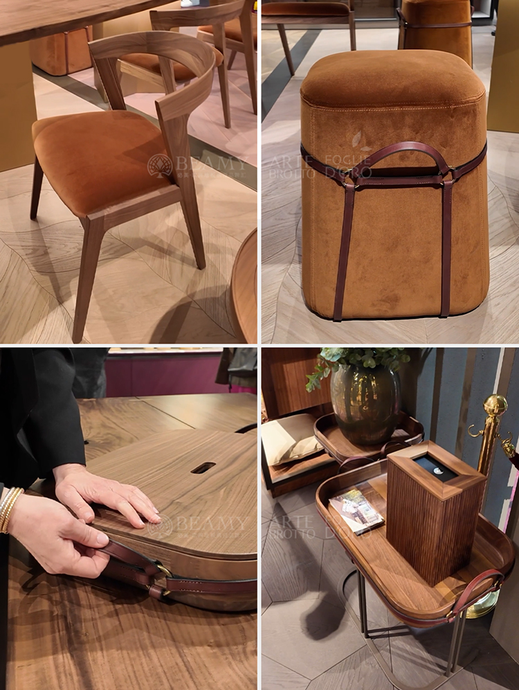 “我們制作的家具是實(shí)心的胡桃木切割出的完整曲線形狀,提手是一家為馬制作裝飾品的公司提供的,也成為是這件家具作品中的一個(gè)獨(dú)特細(xì)節(jié),而同款的皮革細(xì)節(jié),您可以在托盤中找到,對于細(xì)節(jié)的品質(zhì)把控,從而為每一件家具作品賦予魅力。”