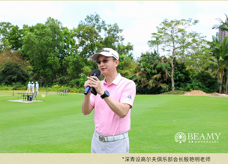 開球儀式正式開始,現場邀請了深圳必美地板分公司總經理陳立先生和深青設高爾夫俱樂部會長殷艷明老師為此次比賽致辭,衷心祝愿本次高爾夫球賽圓滿成功,期盼未來能有更多喜愛高爾夫球的設計師參與到活動中來,希望能夠借助高爾夫球運動創建設計師交流平臺,加強設計師之間的互動,倡導設計師們尋找更加積極向上、健康的生活方式。