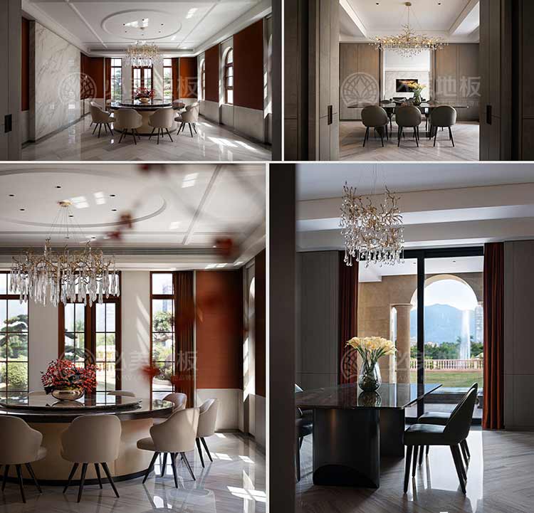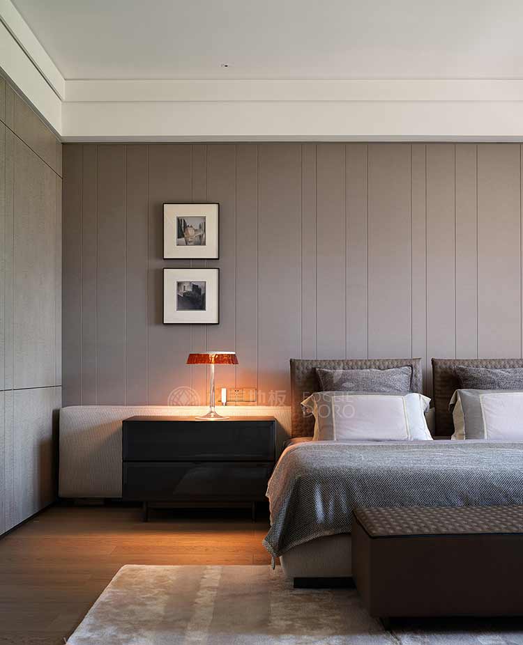 設計在休憩空間更為克制,整體質感的體現通過細節的雕琢來呈現。大面的低飽和設色,給人以靜謐放松的空間感受;張弛有度的線條浸入其中,詮釋居住的美學范式;奢適的尺度容納生活需求,大開窗將光與景的變化全盤收藏。無論是從美學還是功能角度來看,必美菲列德羅巴塞吉奧木地板都是這個空間不可或缺的一部分。