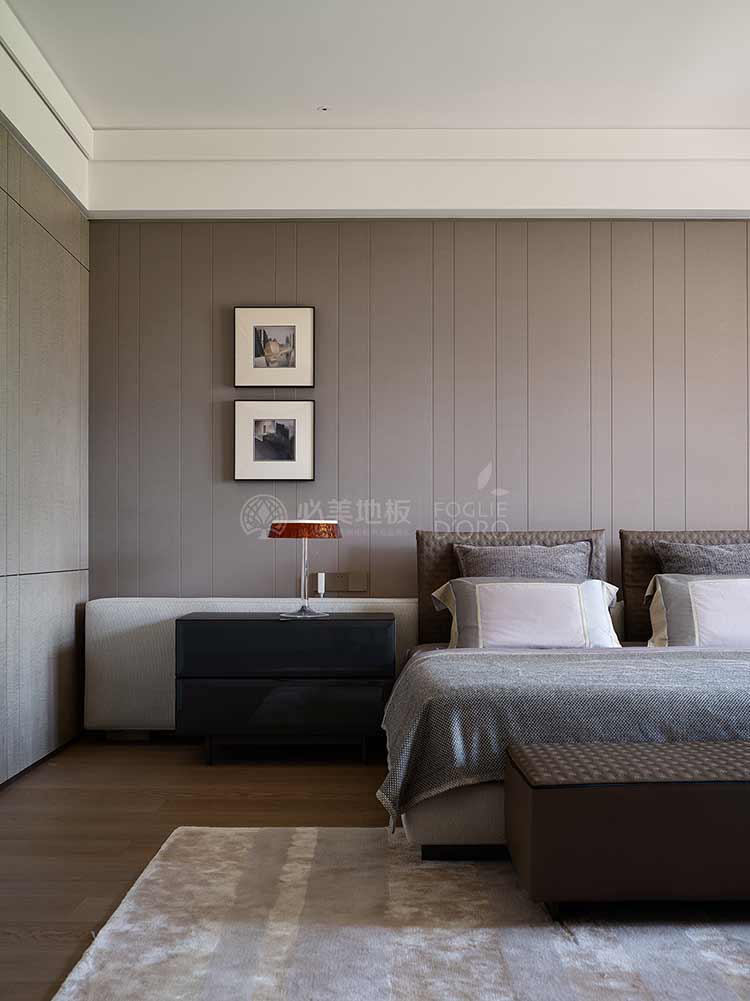 基于空間場景的整體打造,臥室的功能不僅僅考慮居住功能,設計希望臥室也可以像酒店套房一樣成為可以自在休憩的空間。在這間臥室的設計中,必美菲列德羅巴塞吉奧橡木地板成為整個空間的焦點。