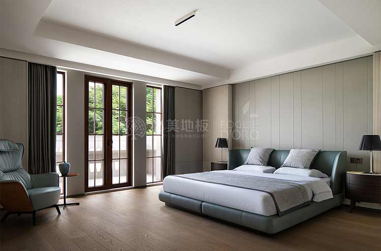 地板以其優雅的橡木紋理和獨特的淡色調完美地融合了現代簡約與自然元素,營造出一種溫馨而寧靜的氛圍,搭配上灰色的墻壁和現代家具,進一步增強了房間的現代感和舒適感,使臥室成為了一個完美的休息和放松之所。