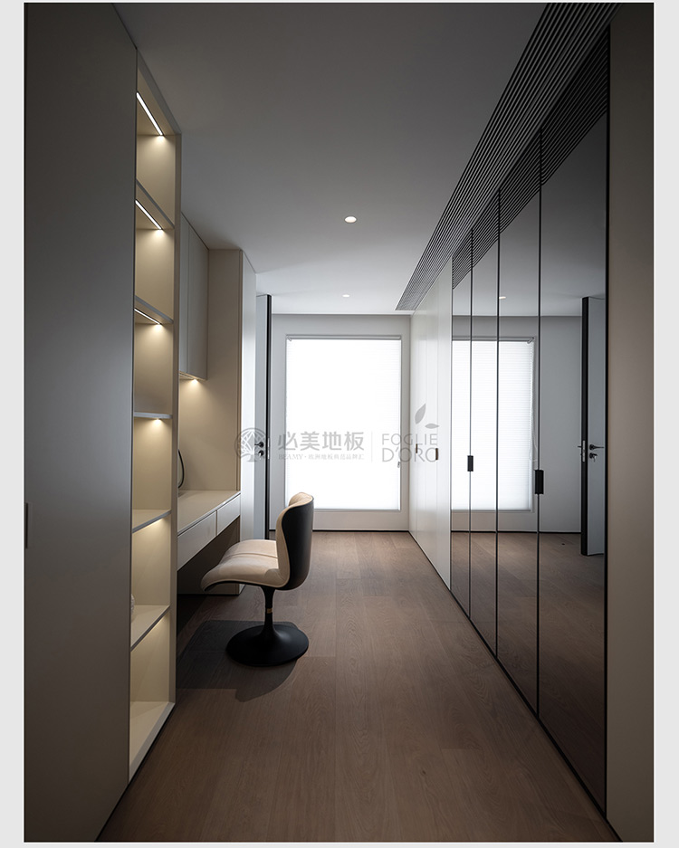 必美菲列德羅巴塞吉奧橡木地板在衣帽間整個(gè)空間的應(yīng)用,低調(diào)優(yōu)雅的外觀,通過(guò)拉絲、染色、清漆等手工制作的加工,增強(qiáng)了木材的自然特性,由經(jīng)驗(yàn)豐富的25年以上的威尼斯工匠以手工拼裝,經(jīng)千錘百煉令品質(zhì)完美無(wú)瑕。