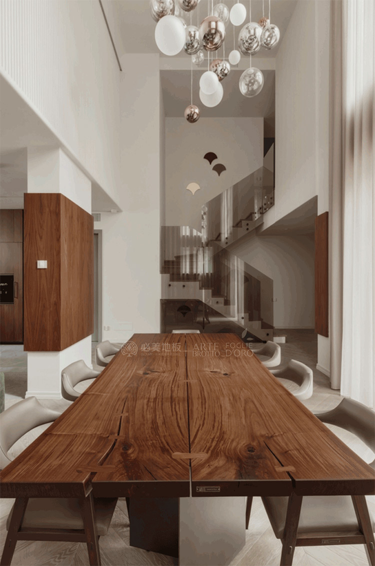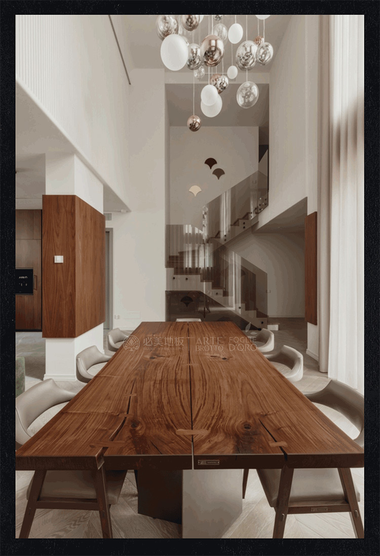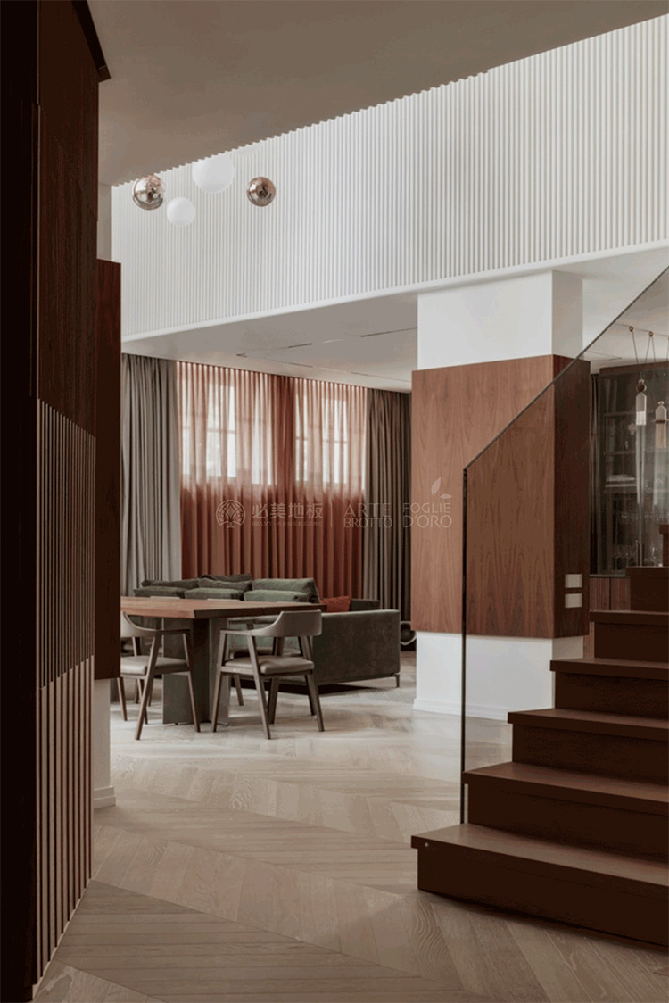 原木色系地板大面積鋪裝這就是豪宅本宅,與整體木質墻面互相呼應,在自然和現代之間創造完美的視覺平衡感,不同空間配置的確在同一地板飾面找到自然共鳴,讓居者回歸大自然,感悟內心的純凈和生活的真諦。