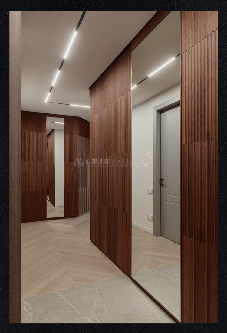必美阿特·布魯托提供的定制解決方案還包括走廊上的華麗衣柜,采用Noce Oliato飾面,Noce Oliata配有尤加利木Grigio Perla門和把手,Noce Oliato的酒窖展示柜,采用Terra飾面和煙熏玻璃結構,在循序漸進的藝術美學中,筑就空間一體化系統化格調。
