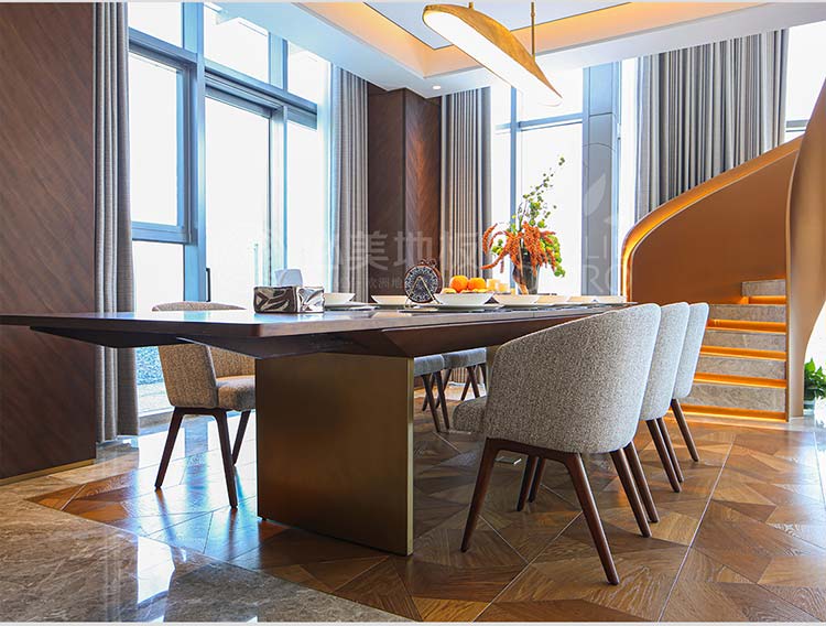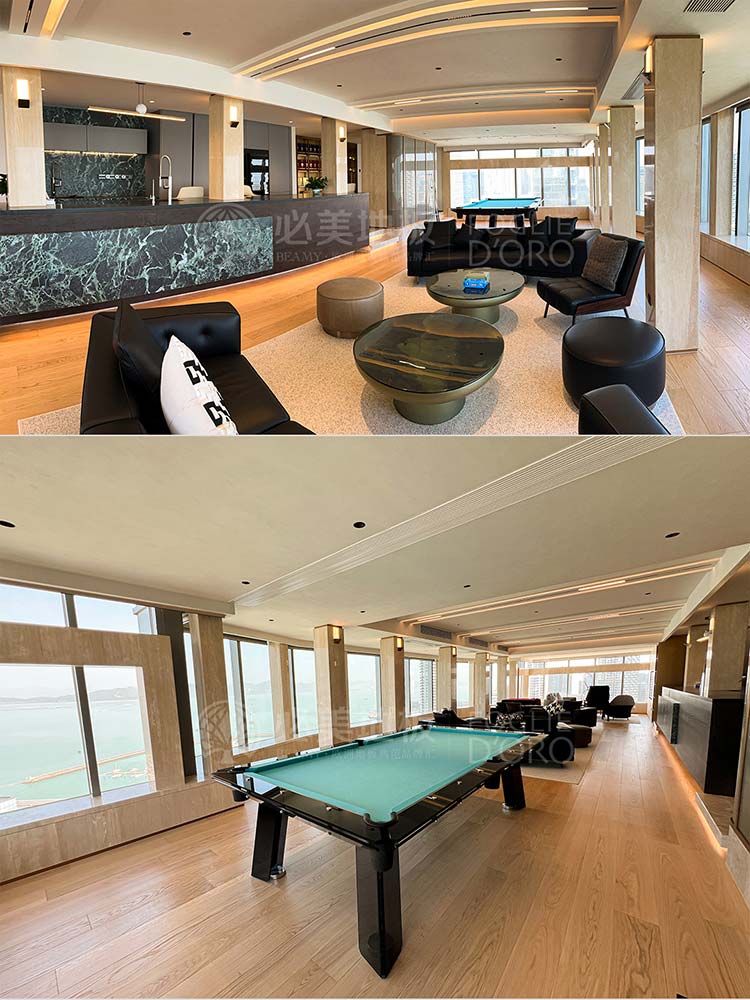 從旋轉(zhuǎn)樓梯的藝術(shù)焦點,到餐客廳弗拉門蒂拼花的幾何動態(tài)節(jié)奏;從茶室碧昂佳橡木的溫潤禪意,到次臥巴薩諾直板的寧靜舒適;從主臥巴塞吉奧橡木的尊貴沉穩(wěn),再到私人會所巴薩諾直板的活力溫吞……在這座深圳灣頂奢復(fù)式別墅中,每一塊必美地板都絕非簡單的地面鋪裝,而是經(jīng)過深思熟慮的空間靈魂塑造者。它們以不同的個性,共同譜寫出一曲關(guān)于自然、藝術(shù)、奢華與生活的和諧交響。
