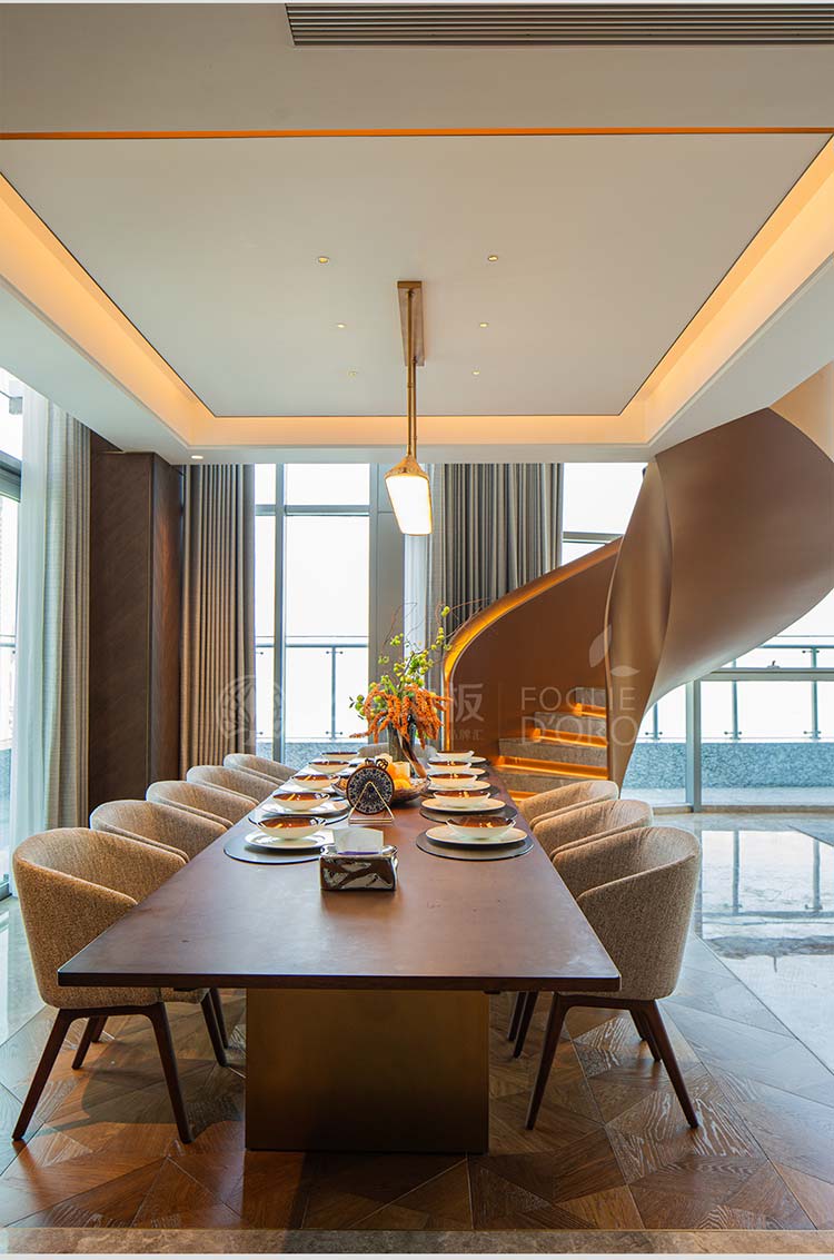 循著樓梯的優(yōu)雅弧度,進(jìn)入整個別墅的核心社交區(qū)域——入口處餐客一體的大廳。設(shè)計師深諳“去繁求簡”的現(xiàn)代輕奢精髓,以簡潔的線條、考究的材質(zhì)和克制的美感,營造出既開闊大氣又溫馨舒適的氛圍。