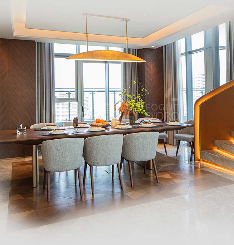 在餐廳區(qū)域地面鋪裝的選擇,是奠定整個空間氣質(zhì)的關(guān)鍵。甄選了來自意大利必美菲列德羅Foglie d’Oro的弗拉門蒂拼花地板。