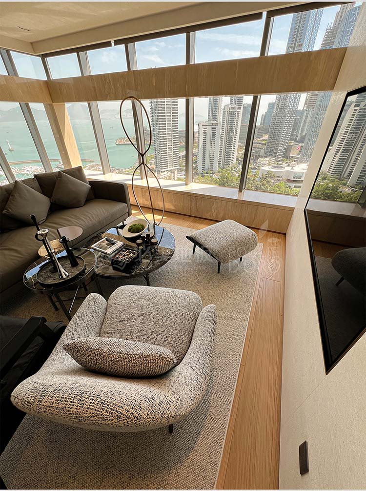 而整個別墅中最令人神往的空間,莫過于主臥套房。它占據(jù)了復(fù)式的最佳觀景位置,擁有一扇俯瞰180°深圳灣海景的巨幅落地窗。在這里,深圳灣的朝暉夕陰都成為了臥室的天然動態(tài)壁畫。為了與這無與倫比的景致相匹配,地面鋪裝的選擇必須達(dá)到“驚艷”的級別,精選了必美菲列德羅的巴塞吉奧橡木地板!