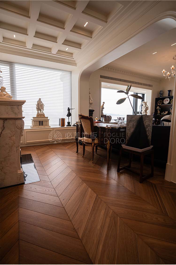 在汕頭內海灣的潮汐聲里,有一棟被時間偏愛的頂級府邸。在這里,古典奢華的靈魂與意大利匠造精神完美邂逅,那片由必美菲列德羅意大利手工工坊直運的薩利亞魚骨拼地板,正以優雅的鋒芒,指向所有關于“奢華”的終極答案!