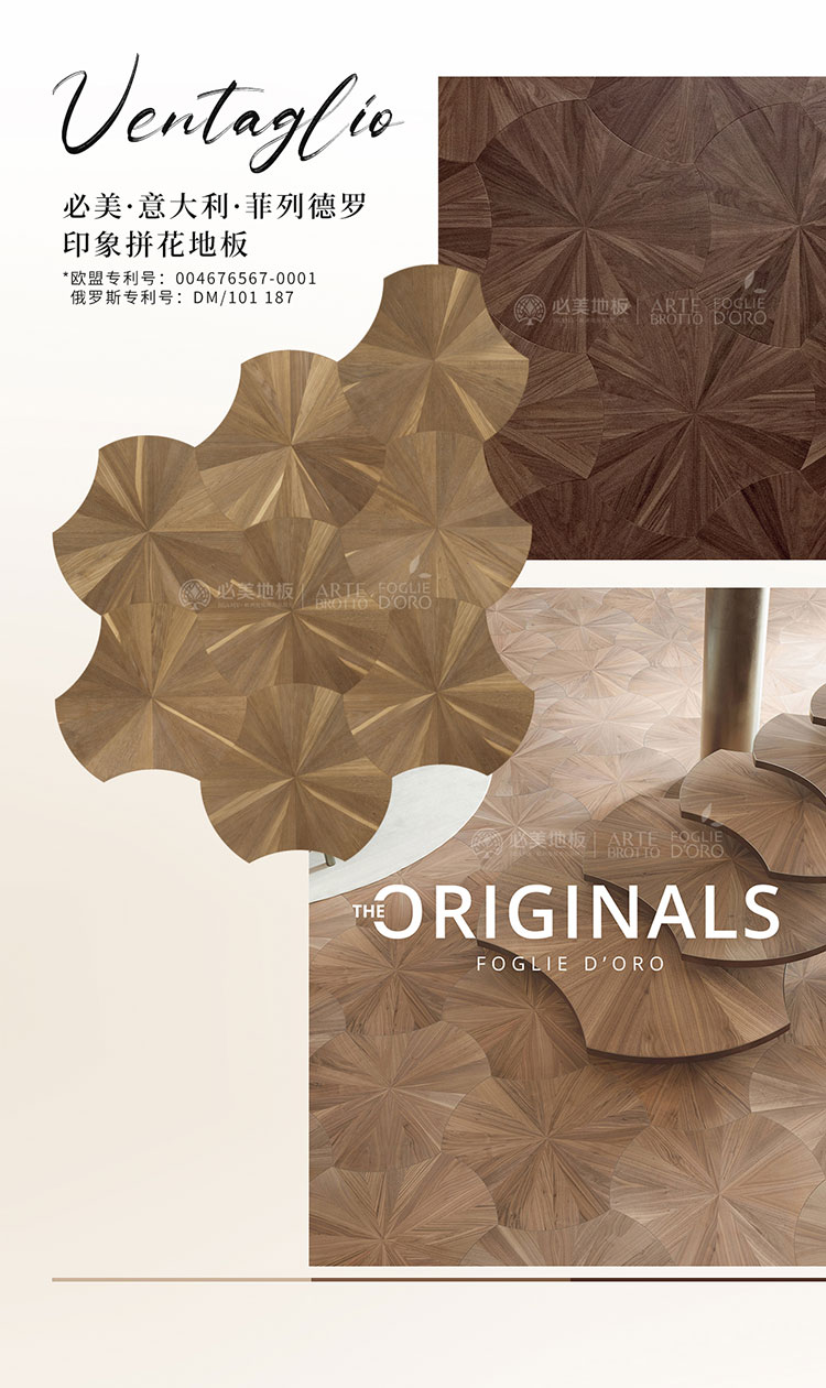 正如原創系列乃至所有必美菲列德羅產品一樣,印象拼花產自意大利,依托工藝專長與創新技術的結合,精選頂級胡桃木與橡木,由資深25年以上的威尼斯工匠純手工制作;在這個系列中,印象拼花以整片板材包覆式的動態表達,彰顯木材的深邃之美,突顯其材料天然的色調。該設計出自Sante Giorgio Brotto之手,是一款獨特的拼花,以其極高的全球辨識度,賦予木材新穎而復雜的表現形式。