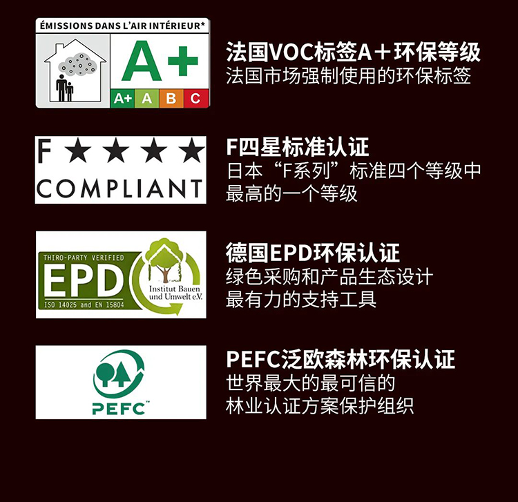 擁有法國(guó)A+&日本F4星等環(huán)保認(rèn)證等級(jí)